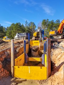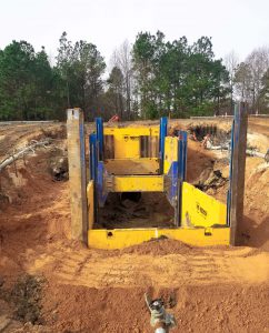 The project site would be located in the surrounding perimeter of the pond for which the contractor would have the task of well pointing the area to minimize the pressure load originated by water and improve the poor soil conditions found in the area. After the well-point process was completed; the contractor noticed an improvement in the soil conditions where the Competent Person on-site classified the sandy soil as Type C-60. The contractor had several concerns with the tight work area and proximity of the adjacent structures such as the failing irrigation line and the overflow intake basin located a few feet apart from where the new structure would be constructed. It was discovered that an underground power line ran between the residential road and the end of the protective system’s pre-determined location, which would force the contractor to carefully work around that section. The contractor would require a modular protective system that could accommodate the existing failing pipeline and allow room for the removal of the existing intake basin. In other words, a lean approach would be needed as 2-ft in each direction and the construction of the new intake basin would have been outside of the parameters of the engineered specs. After reviewing all of the challenges, the contractor reached out to NTS and selected a slide rail system.