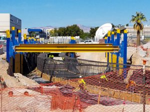 The initial underground configuration would be composed of a 12-bay linear slide rail system with rolling struts inserted through the linear slide rail posts to provide the necessary support against the soil walls. The second underground configuration required a 10-bay linear slide rail system with rolling struts that would begin with 4 larger bays tapering to the necessary smaller size for the remaining 6 bays. The configuration would allow the contractor to construct a temporary ramp entrance directly below the excavation cut. This underground access would allow the contractor to easily unload the materials and equipment needed for the pouring-in.