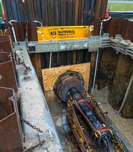 The contractor contacted NTS for a shoring solution. After evaluating various shoring system options, the contractor selected System-80 hydraulic brace combined with interlocking steel sheeting. Interlocking steel sheeting and bracing is a versatile shoring solution that works well with projects that require large pits and removes the need for weld-in-place beams. The Interlocking steel sheeting with hydraulic bracing provided the proper clearance that allowed the contractor to easily maneuver the boring machine in place without compromising the integrity of the existing infrastructure.