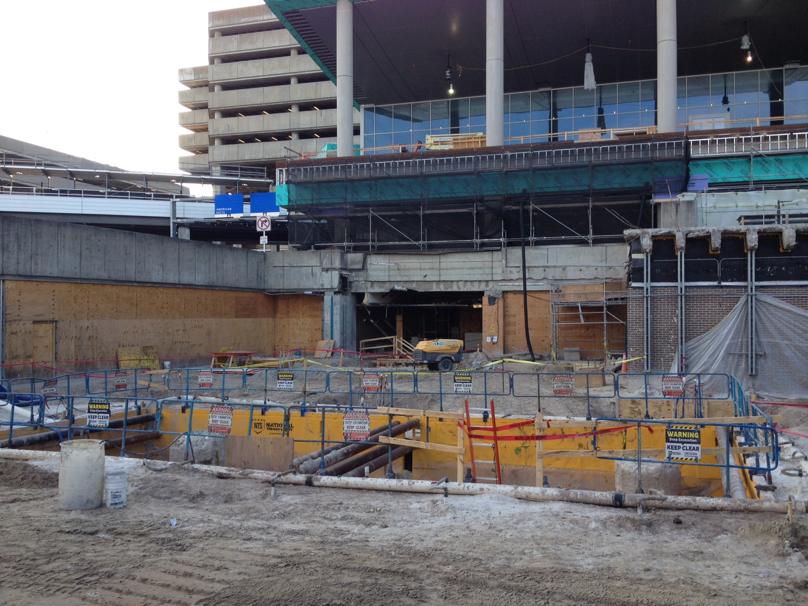 several adjacent structures including an existing terminal, a parking garage, and one additional adjacent building. The contractor met with NTS to discuss potential shoring alternatives for this project, as the excavation requirements presented some unique considerations. The contractor would need to provide four-sided protection the length of the excavation, while also ensuring that the soil walls were properly protected at the large width the project required.